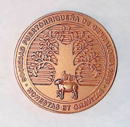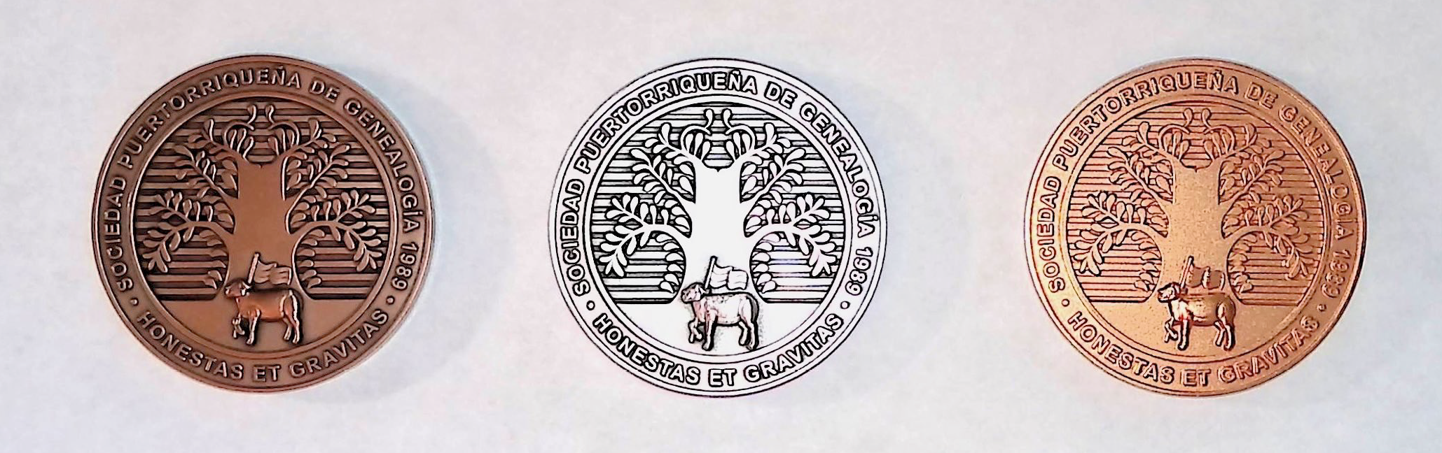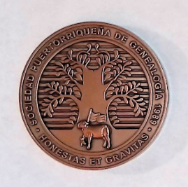 El reverso de la medalla, compuesto por el logo dela SPG, un árbol florido que simboliza, las familias que echan raíces en un sitio y su fortaleza a través del tiempo. En la base del árbol se encuentra parte del símbolo original del escudo de Puerto Rico concedido por España, el Cordero Bíblico mirando hacia la izquierda. En su pata izquierda levantada aguanta un astil con una pequeña bandera blanca. El pequeño astil se hizo de esta manera para dejar a la Cruz como el símbolo característico de Jesús Cristo. En la parte baja, el logo en latín de la SGP, HONESTAS ET GRAVITAS. El mismo significa, Honestidad y Seriedad en la investigación de nuestro pasado a través de las personas que ayudaron a construirlo y el trabajo en general de nuestra sociedad.